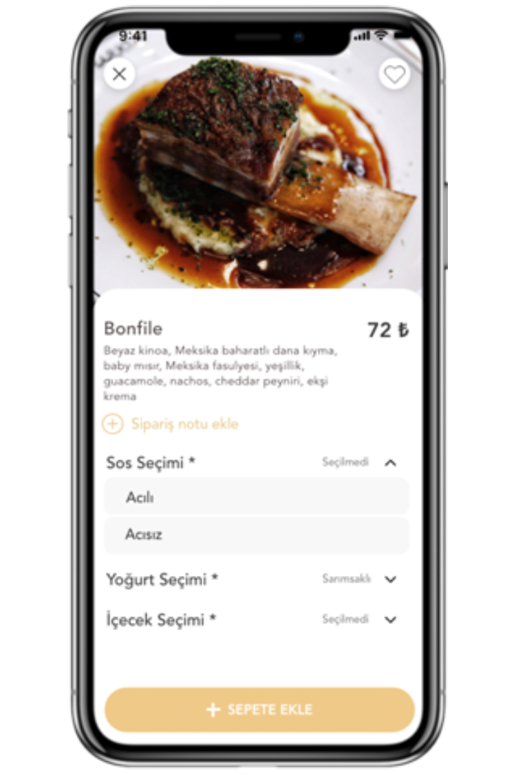 La plataforma permite que distinguidos restaurantes lleguen a sus clientes con métodos de entrega regulares y especiales. Con esta plataforma, se pueden proporcionar servicios de catering además de pedidos instantáneos de comida. La interfaz de la aplicación y los paneles de administración fáciles de usar se desarrollaron desde cero y la aplicación se convirtió en una de las entradas más comentadas de Turquía en las tiendas de aplicaciones.