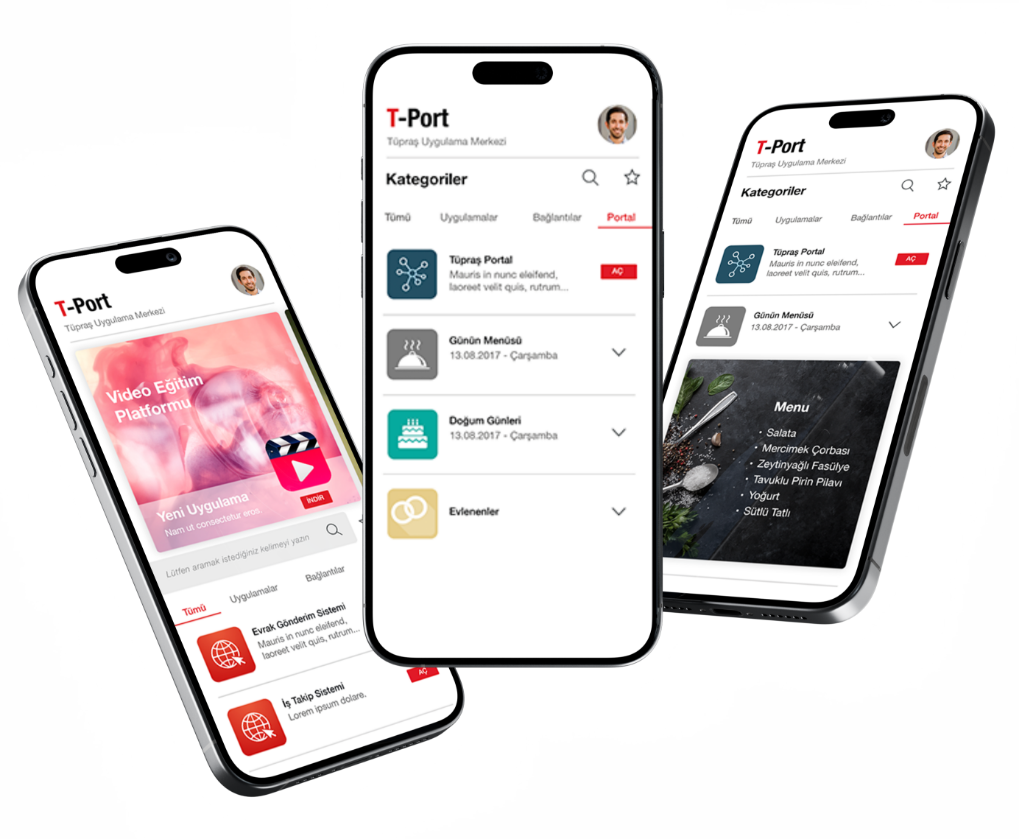 The mobile interfaces of the AppStore developed for Tüpraş were designed to ensure fast, secure, and intuitive access to corporate applications for employees. These user experience-focused interfaces present a wide range of content—such as daily menus, birthday notifications, and a video training platform—in a clean, accessible, and mobile-first layout. With category-based navigation and a card-style application presentation, employees can reach the services they need with just a few taps. This experience not only enhanced accessibility but also significantly improved user satisfaction.